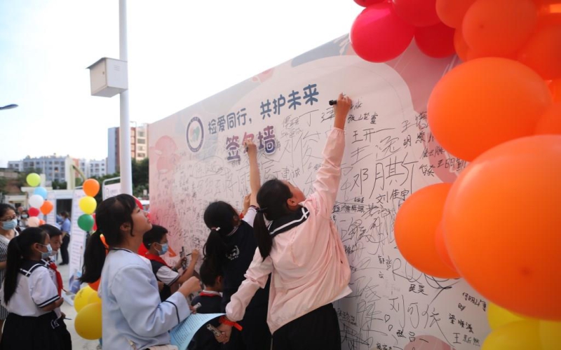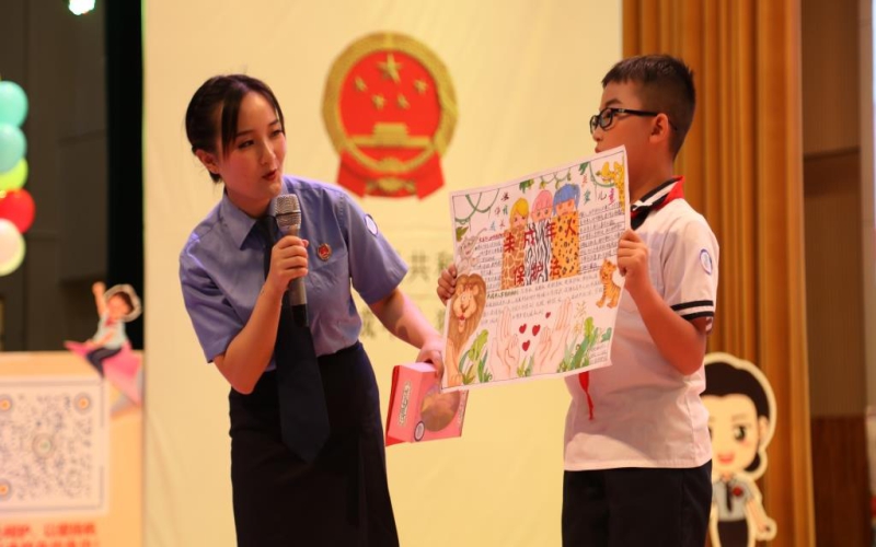 活动在学校乐健馆门口设置有宣传展板、签名墙,检察官为有序进场的学生们张贴“文山未检”logo徽章,发放精心准备的六一儿童节法治小礼物,增强了活动的氛围和仪式感。