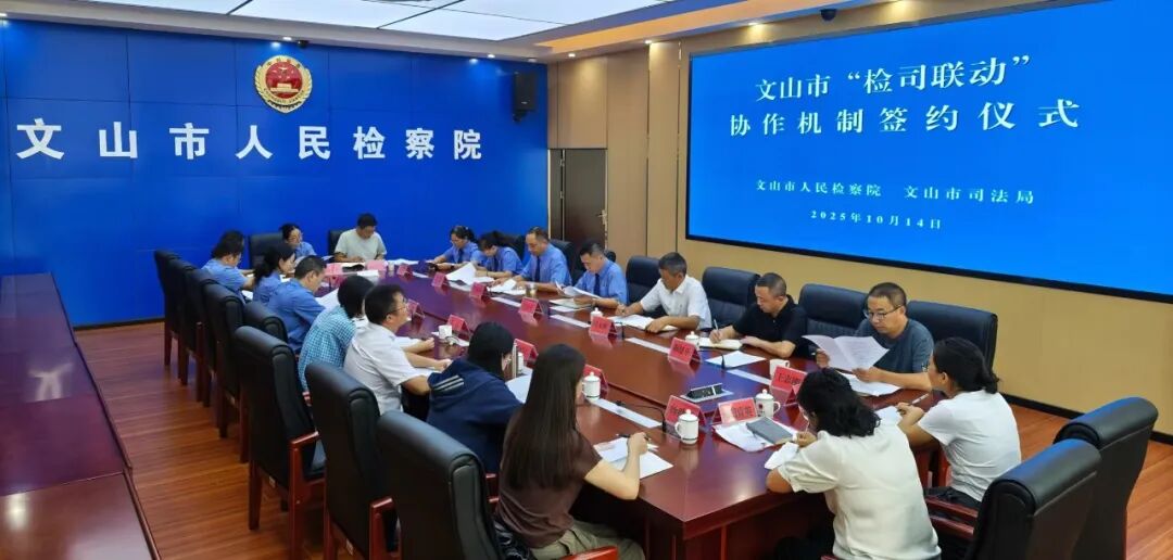 为加强检察机关与司法行政机关在法治建设中的协同配合,提升法律监督与司法行政工作质效,更好服务保障经济社会高质量发展,10月14日,文山市人民检察院与文山市司法局召开“检司联动”协作座谈会,共同签署“检司联动”协作机制。双方班子成员和相关部(股)室负责人18人参加座谈。